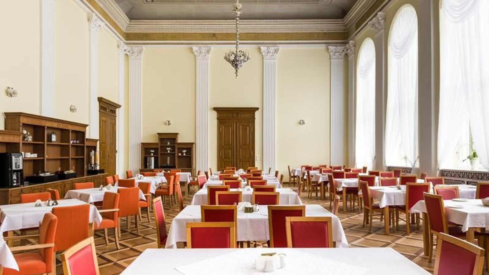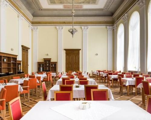 Posiada 100 miejsc we wspaniałej, zabytkowej sali balowej.