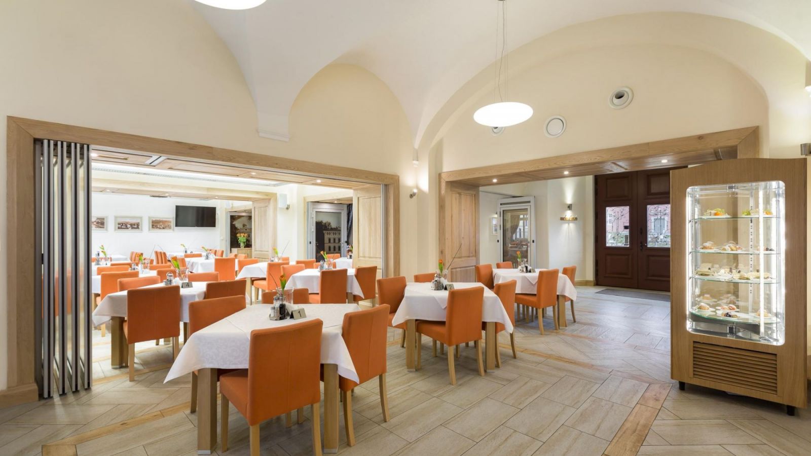 Posiada 75 miejsc w sali ciekawie łączącej zabytkowe wnętrza z nowoczesnym wyposażeniem.