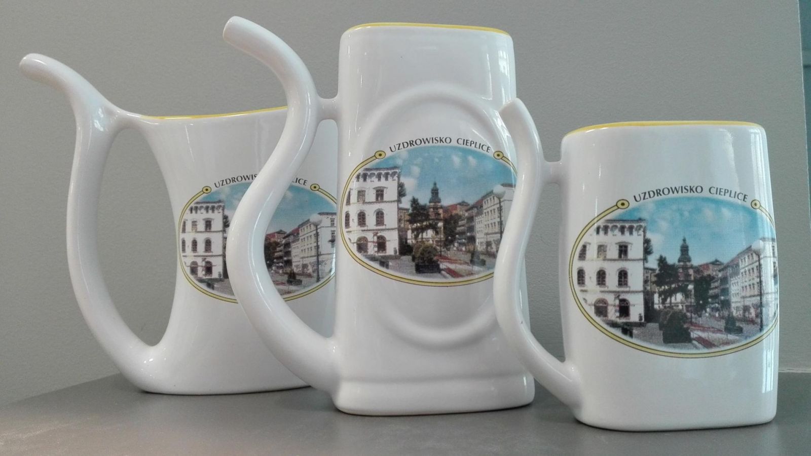 Porcelana - kubki, talerzyki, filiżanki, świeczniki, czajniczki oraz nieodzowne przy kuracju pitnej pijałki. Porcelana ozdabiana jest fotografiami z cieplickiego zdroju.