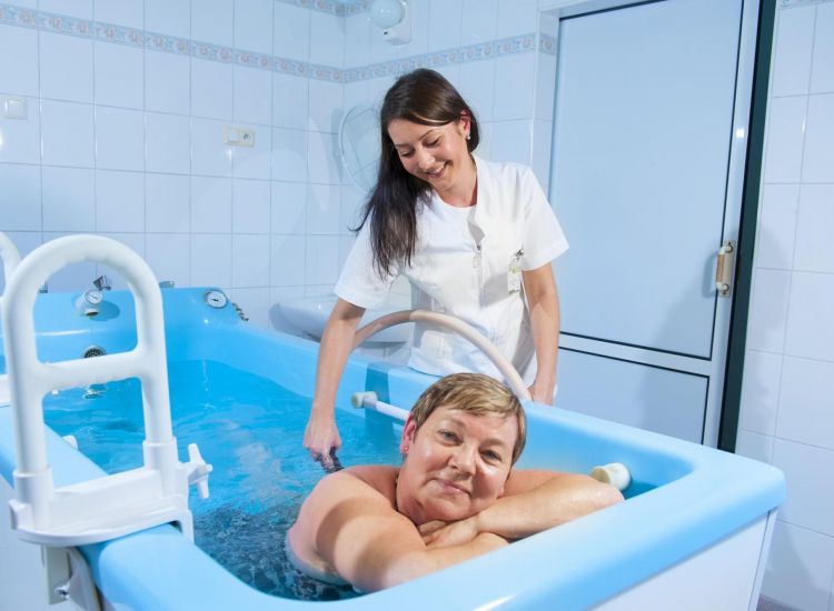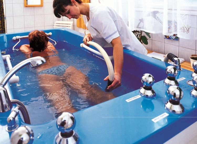 Die Behandlung wird in einer Wanne mit heilendem Thermalwasser, unter Verwendung von Druckluft, die aus den Düsen an den Wänden der Wanne strömt, durchgeführt.