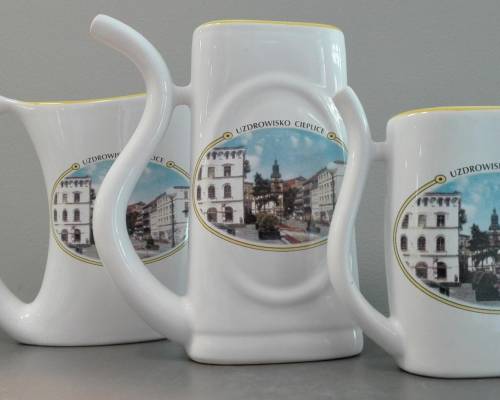 Porcelana - kubki, talerzyki, filiżanki, świeczniki, czajniczki oraz nieodzowne przy kuracju pitnej pijałki. Porcelana ozdabiana jest fotografiami z cieplickiego zdroju.